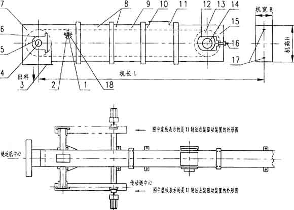9、輸送鏈 10、中間節(非標) 11、進料口 12、尾軸承箱 13、尾輪 14、尾軸 15、尾部