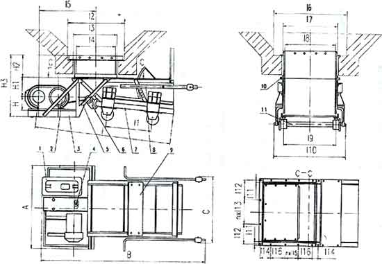 ??1、減速機(jī) 2、電動(dòng)機(jī) 3、傳動(dòng)平臺(tái) 4、聯(lián)軸器 5、H形架 6、連桿 7、給煤槽 8、閘門 9、機(jī)架 10、漏斗 11、托輥